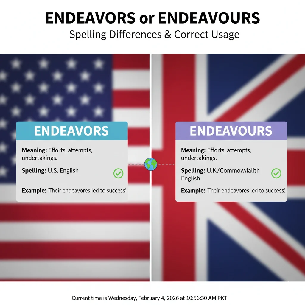 If you’re writing for a US audience, use endeavors. If your readers are in the UK or Commonwealth countries, endeavours is the right choice. For global writing, consistency matters more than the spelling itself.