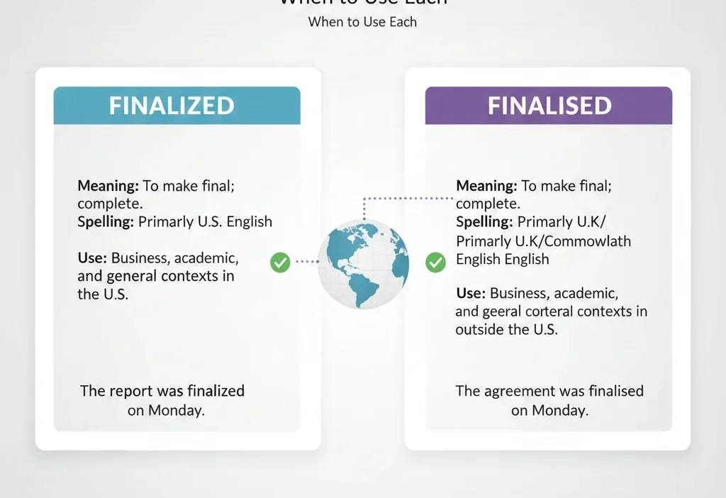 If your audience is American, finalized is the right choice. If your readers are in the UK or follow Oxford English rules, finalised is correct. Canadian writers can use both, but consistency is essential.